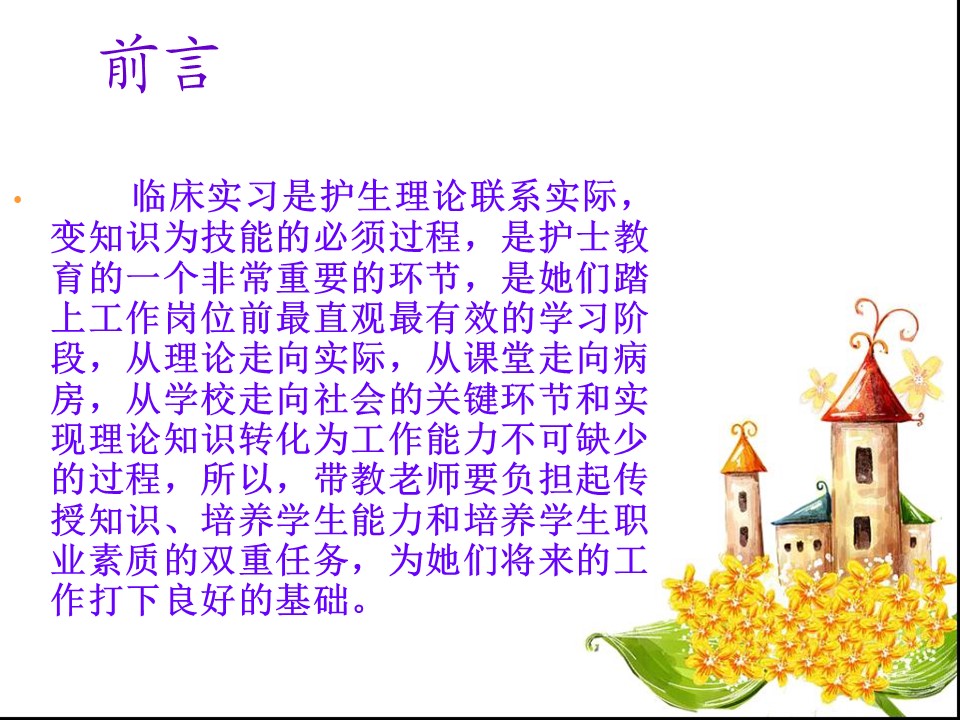 临床实习是护生理论联系实际,变知识为技能的必须过程,是护士教育的一个非常重要的环节,是她们踏上工作岗位前最直观最有效的学习阶段,从理论走向实际,从课堂走向病房,从学校走向社会的关键环节和实现理论知识转化为工作能力不可缺少的过程,所以,带教老师要负担起传授知识、培养学生能力和培养学生职业素质的双重任务,为她们将来的工作打下良好的基础。